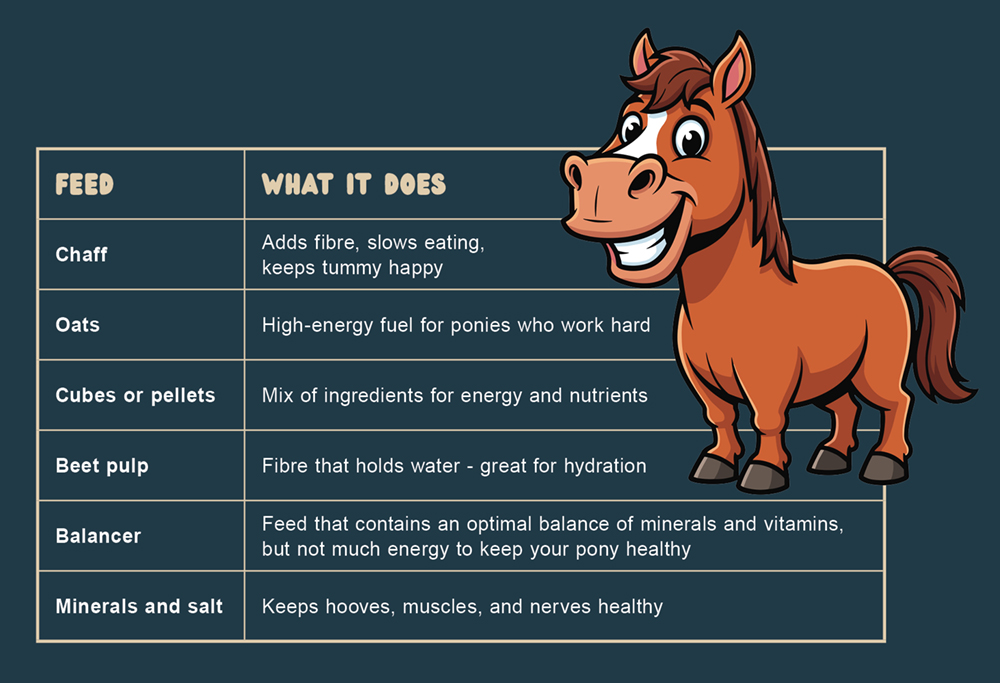 But here’s the trick with all of this: too much energy feed can make ponies fizzy or even sick, too little fibre can give them ulcers, and the wrong balance of minerals and vitamins can lead to health problems. That’s why every diet needs balance with enough energy to work, but not so much that your pony feels like a rocket, or gets unwell.
