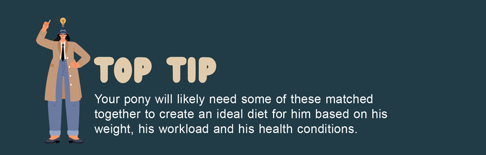 Then come energy feeds like concentrates; these are for ponies who work harder and need a bit more fuel. Finally, we have the balancing ingredients; they ensure your pony gets all the minerals and vitamins they need to stay healthy.